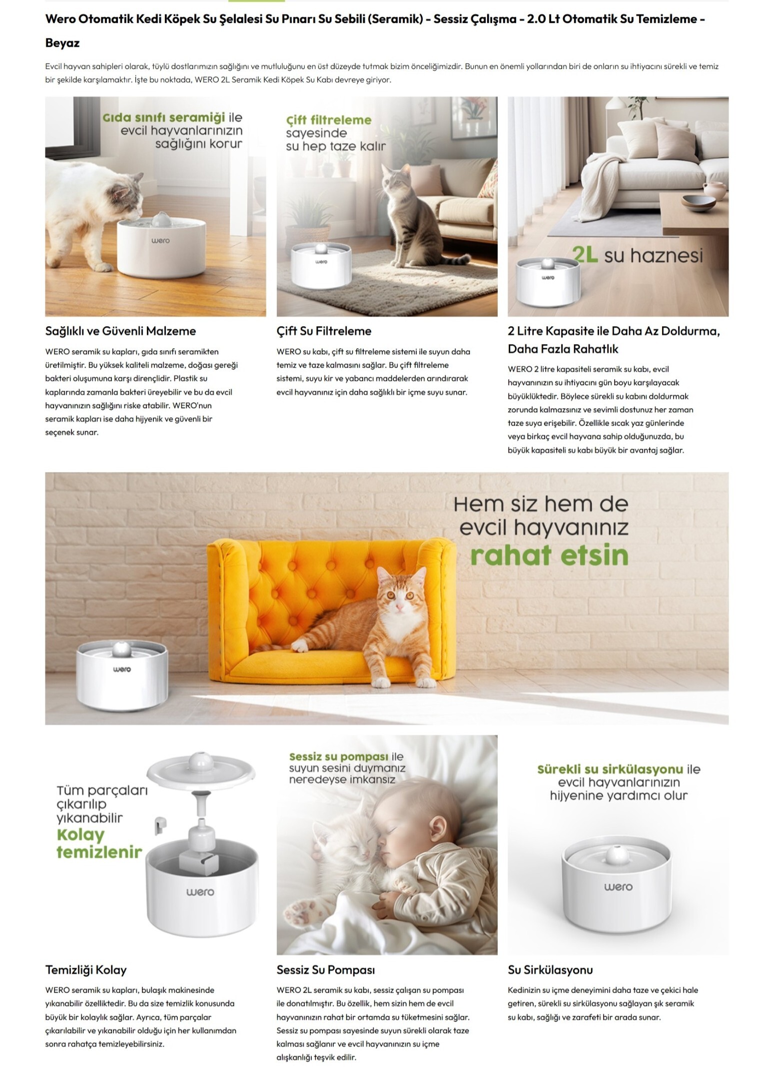 Wero Otomatik Kedi Köpek Su Şelalesi Su Pınarı Su Sebili (Seramik) 2 LT